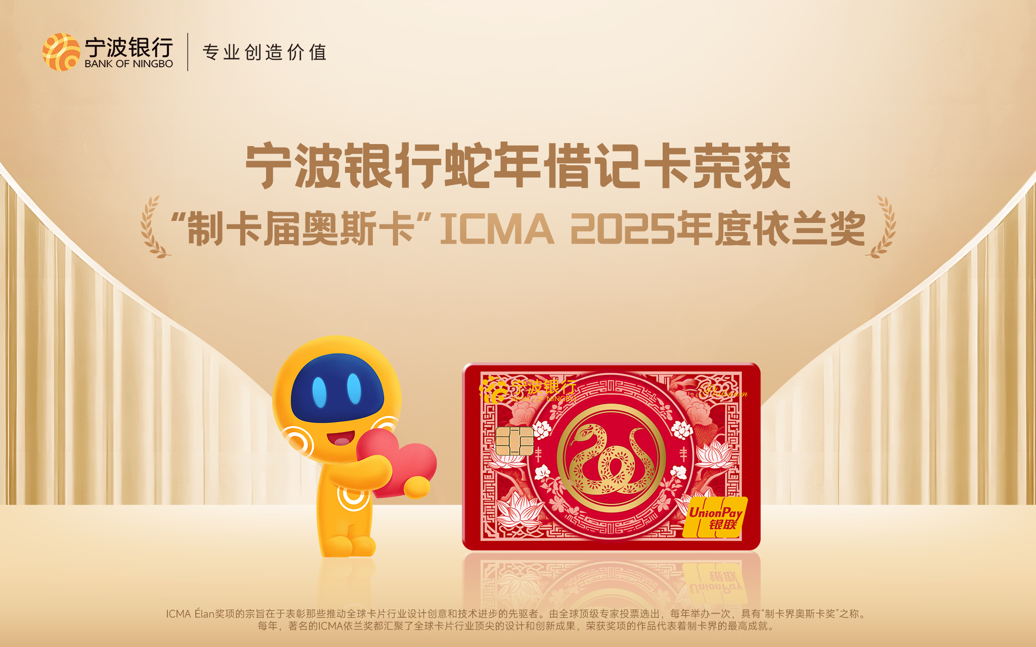 2025年5月國際卡制造商協(xié)會(ICMA)依蘭獎(éLAN)評選落下帷幕,寧波銀行 蛇年生肖白金借記卡榮獲最佳安全支付卡評委會大獎。這不僅是對寧波銀行在金融產(chǎn)品設(shè)計(jì)領(lǐng)域卓越創(chuàng)新的高度認(rèn)可,更是一次將中國傳統(tǒng)文化與現(xiàn)代金融工藝完美融合的驚艷亮相。